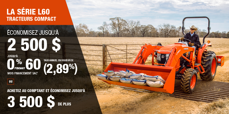 Remise de 2 500 $ disponible sur les achats au comptant d'un nouveau L3560/L4060 Rops seulement. Remise de 3 500 $ disponible sur les achats au comptant d'un nouveau L3560/L4060 Cab seulement. Financement à 0 % pendant 60 mois disponible uniquement sur les modèles L3560/4060 Rops ou Cab neufs et non immatriculés auparavant. Financement à 0 % pendant 48 mois disponible uniquement sur les modèles L4760/5460/6060 Rops ou Cab neufs et non immatriculés auparavant.