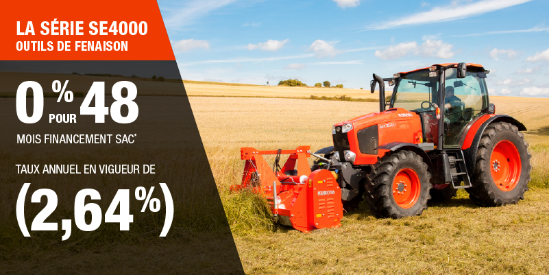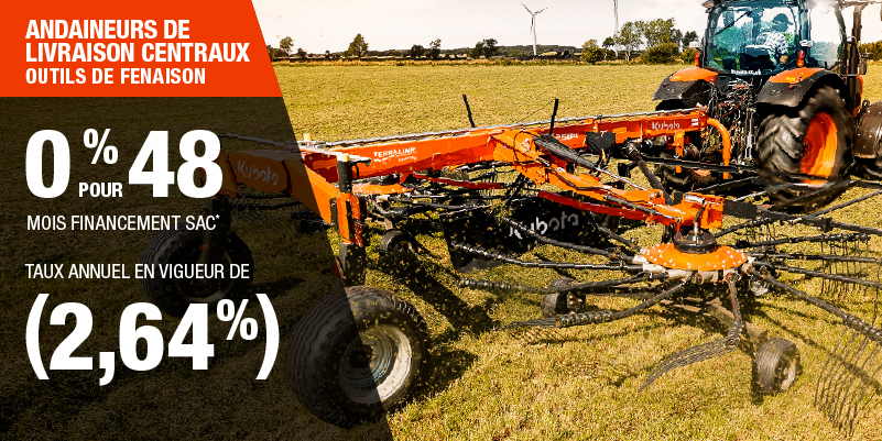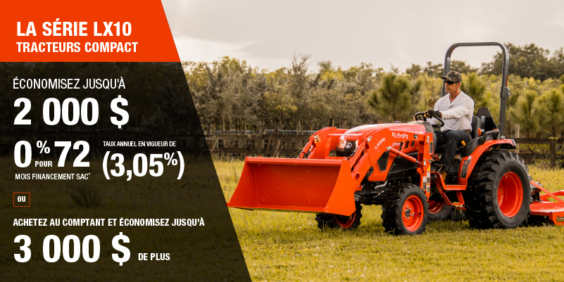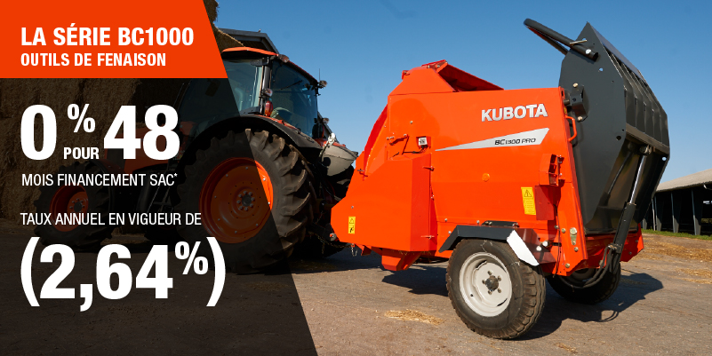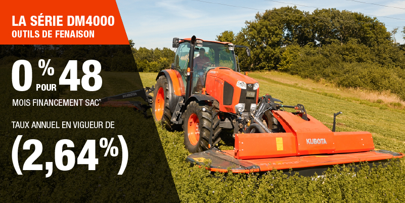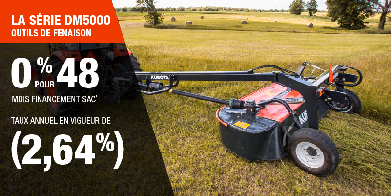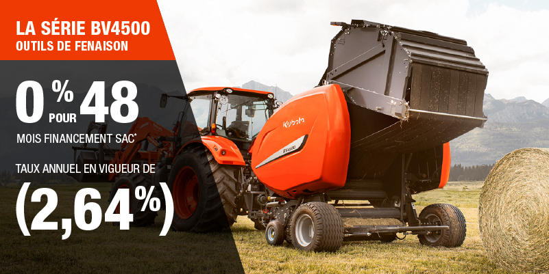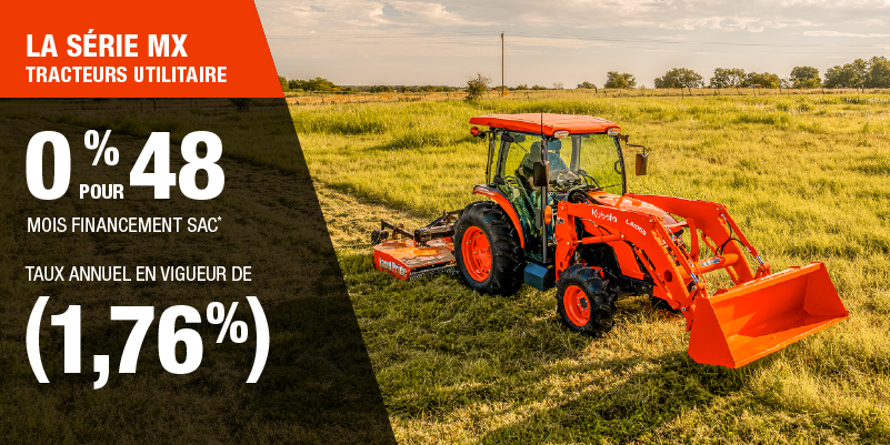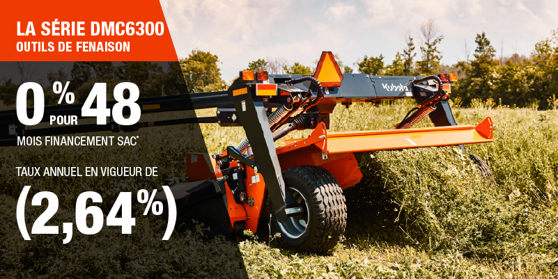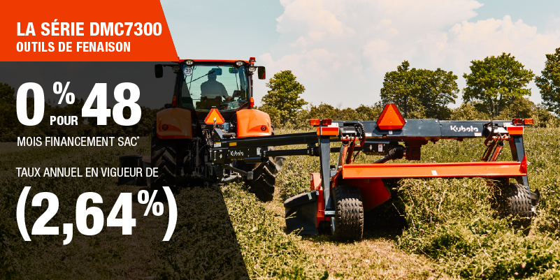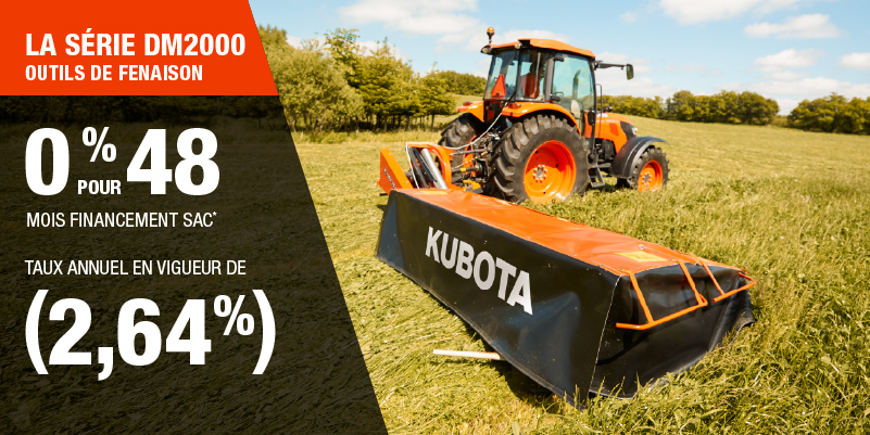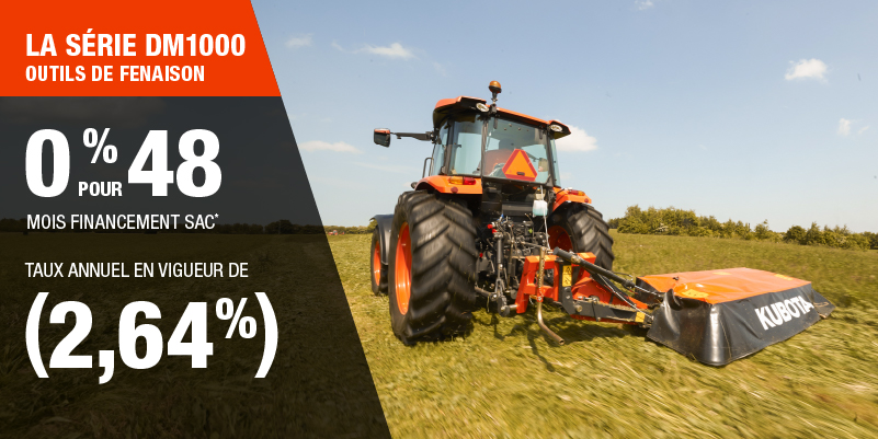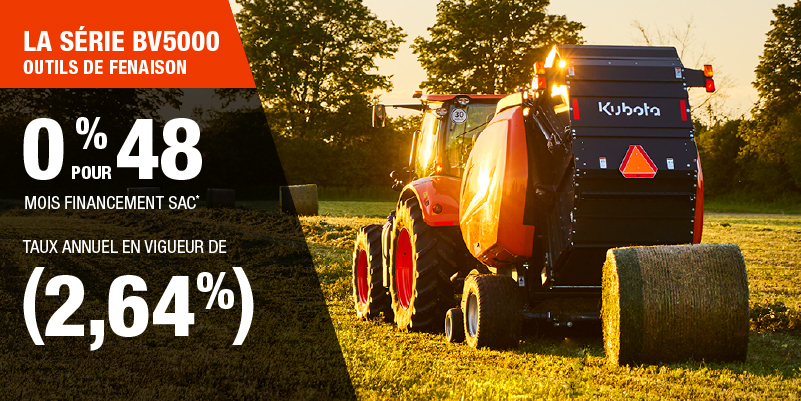 Un acompte initial minimal de 10 % est exigé pour les offres de financement pour les produits agricoles ou pour la pelouse. Les spécifications, caractéristiques, illustrations et équipements présentés se basent sur les plus récents renseignements disponibles au moment de la publication. Certains modèles sont présentés avec des accessoires offerts en option à un coût additionnel. Bien que les descriptions soient réputées bonnes, leur exactitude ne peut être garantie. Nous nous réservons le droit de modifier en tout temps, sans avis ni obligation, les spécifications, accessoires, matériels, modèles, prix, paiements et autres renseignements. L’offre est valide jusqu’au 12 janvier 2026. Consultez votre concessionnaire Kubota participant ou le www.kubota.ca pour obtenir tous les détails.
