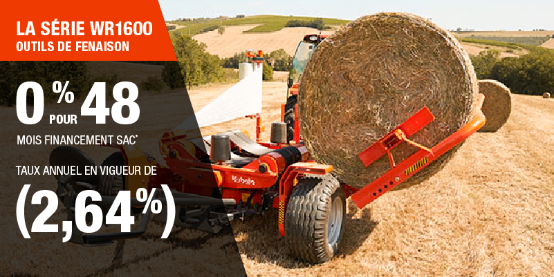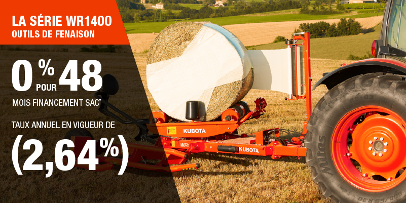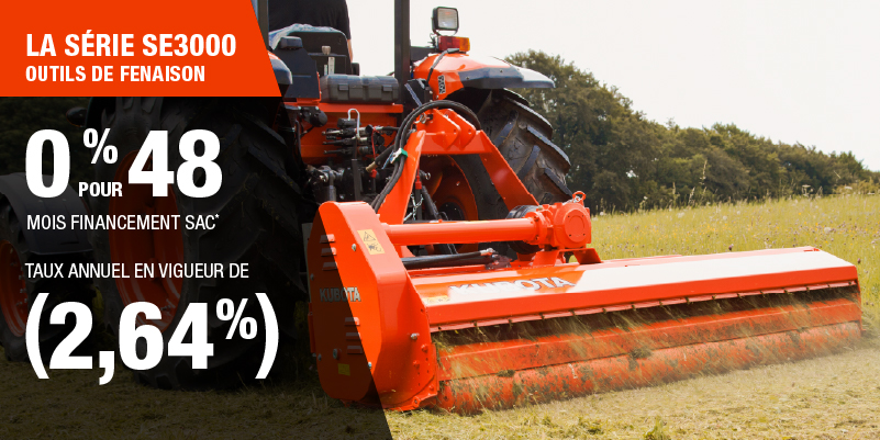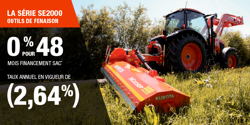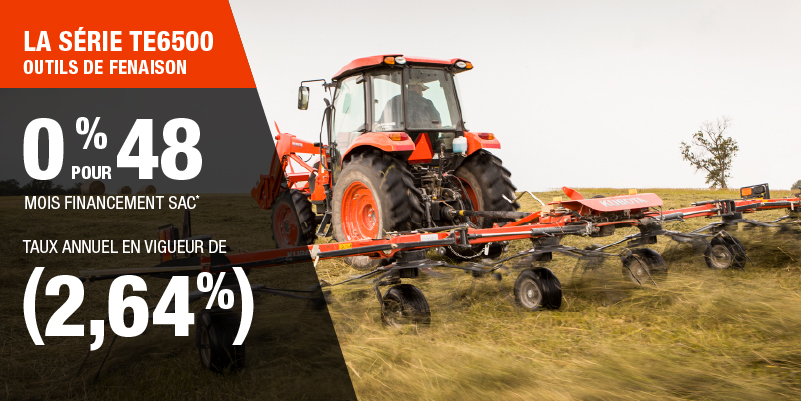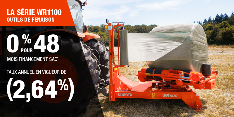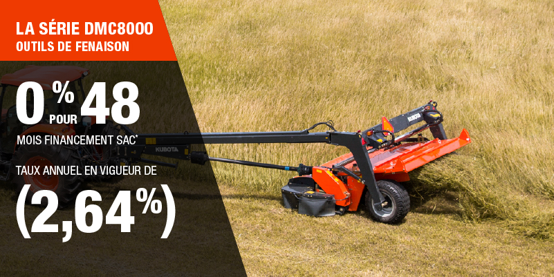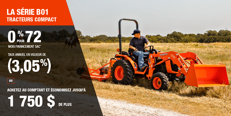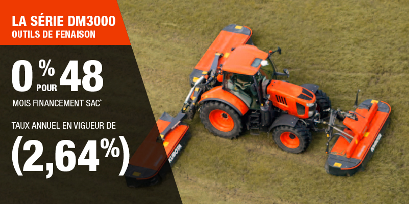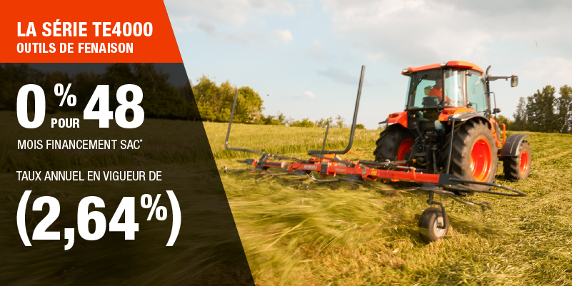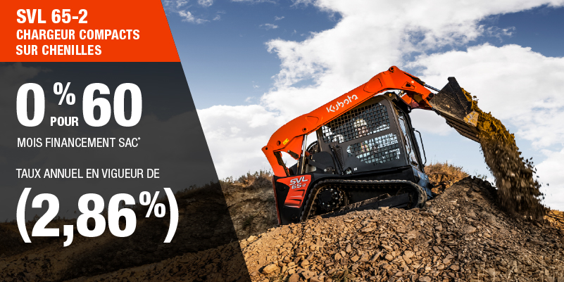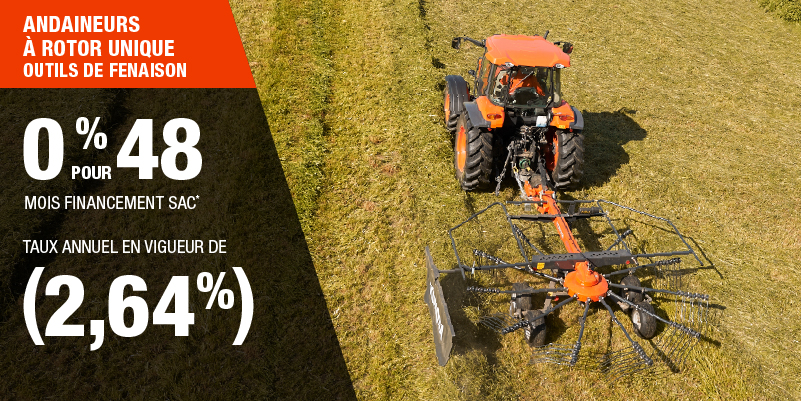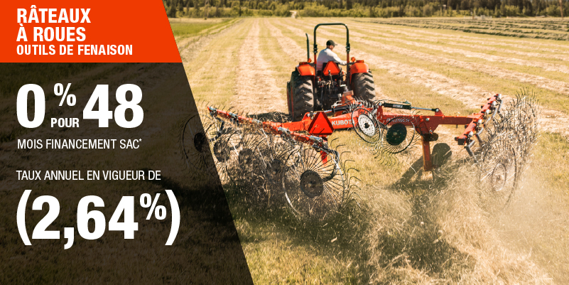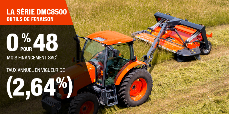 Un acompte initial minimal de 10 % est exigé pour les offres de financement pour les produits agricoles ou pour la pelouse. Les spécifications, caractéristiques, illustrations et équipements présentés se basent sur les plus récents renseignements disponibles au moment de la publication. Certains modèles sont présentés avec des accessoires offerts en option à un coût additionnel. Bien que les descriptions soient réputées bonnes, leur exactitude ne peut être garantie. Nous nous réservons le droit de modifier en tout temps, sans avis ni obligation, les spécifications, accessoires, matériels, modèles, prix, paiements et autres renseignements. L’offre est valide jusqu’au 12 janvier 2026. Consultez votre concessionnaire Kubota participant ou le www.kubota.ca pour obtenir tous les détails.