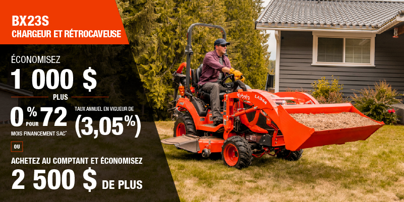 Les rabais présentés sont offerts à l'achat d'un modèle BX23S neuf qui n'a jamais été immatriculé précédemment est de 1 000,00 $. L'offre ne s'applique pas aux transactions passées et n'a aucune valeur de rachat.