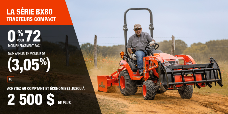 Voici un exemple de financement représentatif pour le BX1880V-1: un montant de 15 780,50 $ financé à 0% (taux annuel effectif global de 3,05% incluant 1 230,88 $ en comptant qui ne peut être combinées avec des offres de financement) correspond à un paiement bihebdomadaire de 91,04 $ pendant 72 mois. Répartis sur 72 mois, 156 paiements bihebdomadaires sont requis. Un acompte initial de 1 578,05 $ est requis. Le coût d'emprunt est de 1 230,88 $ pour une obligation totale de 15 780,50 $. Le financement est offert sur approbation du crédit. Les prix et paiements incluent les coûts de transport et les autres frais applicables (dont les frais environnementaux, les frais de gestion, les frais de préparation, et les frais du concessionnaire pour le modèle précisé). Remise de 2 500 $ offerte uniquement à l'achat au comptant d'un nouveau modèle BX23S. Remise de 1 500 $ offerte à l'achat au comptant de tous autres modèles. L'offre est valide jusqu'au 12-01-2026