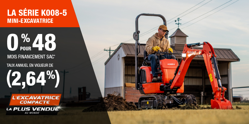 Voici un exemple de financement représentatif pour le K008-5: un montant de 36 821,58 $ financé à 0% (taux annuel effectif global de 2,64% incluant 1 723,25 $ en comptant qui ne peut être combinées avec des offres de financement) correspond à un paiement de 690,40 $ par mois pendant 48 mois. Un acompte initial de 3 682,16 $ est requis. Le coût d'emprunt est de 1 723,25 $ pour une obligation totale de 36 821,58 $. Le financement est offert sur approbation du crédit. Les prix et paiements incluent les coûts de transport et les autres frais applicables (dont les frais environnementaux, les frais de gestion, les frais de préparation, et les frais du concessionnaire pour le modèle précisé). Kubota est le numéro un mondial des ventes de pelles compactes depuis 20 ans. Clause de non-responsabilité : Selon les données de 2023 d'Off-Highway Research incluant toutes les ventes de la marque du groupe Kubota. L'offre est valide jusqu'au 12-01-2026