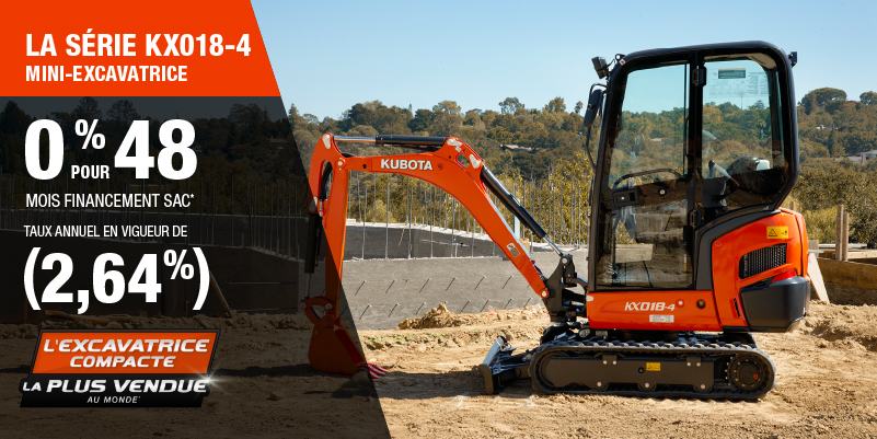 Voici un exemple de financement représentatif pour le KX018-4: un montant de 51 974,97 $ financé à 0% (taux annuel effectif global de 2,64% incluant 2 432,43 $ en comptant qui ne peut être combinées avec des offres de financement) correspond à un paiement de 974,53 $ par mois pendant 48 mois. Un acompte initial de 5 197,50 $ est requis. Le coût d'emprunt est de 2 432,43 $ pour une obligation totale de 51 974,97 $. Le financement est offert sur approbation du crédit. Les prix et paiements incluent les coûts de transport et les autres frais applicables (dont les frais environnementaux, les frais de gestion, les frais de préparation, et les frais du concessionnaire pour le modèle précisé). Kubota est le numéro un mondial des ventes de pelles compactes depuis 20 ans. Clause de non-responsabilité : Selon les données de 2023 d'Off-Highway Research incluant toutes les ventes de la marque du groupe Kubota. L'offre est valide jusqu'au 12-01-2026