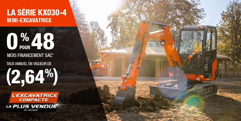 Voici un exemple de financement représentatif pour le KX030-4: un montant de 66 597,33 $ financé à 0% (taux annuel effectif global de 2,64% incluant 3 116,76 $ en comptant qui ne peut être combinées avec des offres de financement) correspond à un paiement de 1 248,70 $ par mois pendant 48 mois. Un acompte initial de 6 659,73 $ est requis. Le coût d'emprunt est de 3 116,76 $ pour une obligation totale de 66 597,33 $. Le financement est offert sur approbation du crédit. Les prix et paiements incluent les coûts de transport et les autres frais applicables (dont les frais environnementaux, les frais de gestion, les frais de préparation, et les frais du concessionnaire pour le modèle précisé). Kubota est le numéro un mondial des ventes de pelles compactes depuis 20 ans. Clause de non-responsabilité : Selon les données de 2023 d'Off-Highway Research incluant toutes les ventes de la marque du groupe Kubota. L'offre est valide jusqu'au 12-01-2026