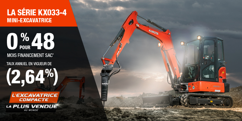Voici un exemple de financement représentatif pour le KX033-4: un montant de 85 552,41 $ financé à 0% (taux annuel effectif global de 2,64% incluant 4 003,85 $ en comptant qui ne peut être combinées avec des offres de financement) correspond à un paiement de 1 604,11 $ par mois pendant 48 mois. Un acompte initial de 8 555,24 $ est requis. Le coût d'emprunt est de 4 003,85 $ pour une obligation totale de 85 552,41 $. Le financement est offert sur approbation du crédit. Les prix et paiements incluent les coûts de transport et les autres frais applicables (dont les frais environnementaux, les frais de gestion, les frais de préparation, et les frais du concessionnaire pour le modèle précisé). Kubota est le numéro un mondial des ventes de pelles compactes depuis 20 ans. Clause de non-responsabilité : Selon les données de 2023 d'Off-Highway Research incluant toutes les ventes de la marque du groupe Kubota. L'offre est valide jusqu'au 12-01-2026
