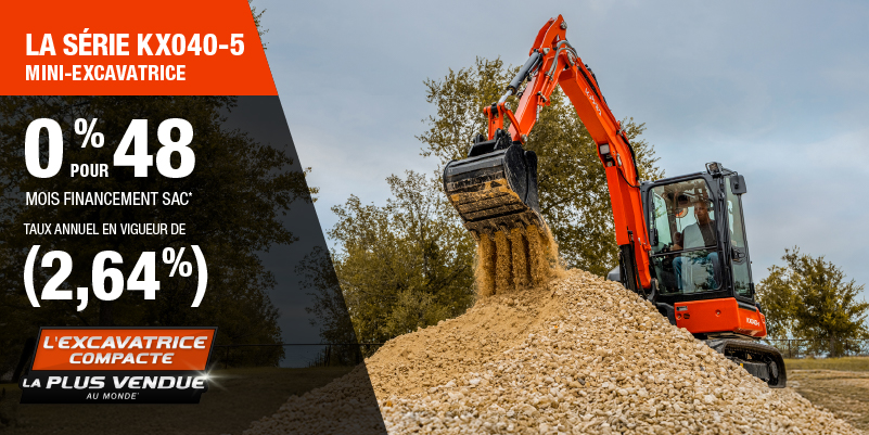 Voici un exemple de financement représentatif pour le KX040-5: un montant de 91 349,26 $ financé à 0% (taux annuel effectif global de 2,64% incluant 4 275,15 $ en comptant qui ne peut être combinées avec des offres de financement) correspond à un paiement de 1 712,80 $ par mois pendant 48 mois. Un acompte initial de 9 134,93 $ est requis. Le coût d'emprunt est de 4 275,15 $ pour une obligation totale de 91 349,26 $. Le financement est offert sur approbation du crédit. Les prix et paiements incluent les coûts de transport et les autres frais applicables (dont les frais environnementaux, les frais de gestion, les frais de préparation, et les frais du concessionnaire pour le modèle précisé). Kubota est le numéro un mondial des ventes de pelles compactes depuis 20 ans. Clause de non-responsabilité : Selon les données de 2023 d'Off-Highway Research incluant toutes les ventes de la marque du groupe Kubota. L'offre est valide jusqu'au 12-01-2026