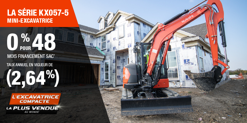 Voici un exemple de financement représentatif pour le KX057-5: un montant de 118 641,26 $ financé à 0% (taux annuel effectif global de 2,64% incluant 5 552,41 $ en comptant qui ne peut être combinées avec des offres de financement) correspond à un paiement de 2 224,52 $ par mois pendant 48 mois. Un acompte initial de 11 864,13 $ est requis. Le coût d'emprunt est de 5 552,41 $ pour une obligation totale de 118 641,26 $. Le financement est offert sur approbation du crédit. Les prix et paiements incluent les coûts de transport et les autres frais applicables (dont les frais environnementaux, les frais de gestion, les frais de préparation, et les frais du concessionnaire pour le modèle précisé). Kubota est le numéro un mondial des ventes de pelles compactes depuis 20 ans. Clause de non-responsabilité : Selon les données de 2023 d'Off-Highway Research incluant toutes les ventes de la marque du groupe Kubota. L'offre est valide jusqu'au 12-01-2026