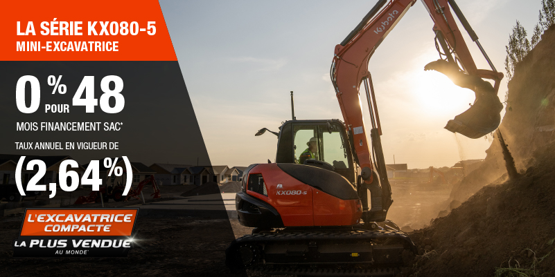 Voici un exemple de financement représentatif pour le KX080-5: un montant de 180 598,10 $ financé à 0% (taux annuel effectif global de 2,64% incluant 8 451,99 $ en comptant qui ne peut être combinées avec des offres de financement) correspond à un paiement de 3 386,21 $ par mois pendant 48 mois. Un acompte initial de 18 059,81 $ est requis. Le coût d'emprunt est de 8 451,99 $ pour une obligation totale de 180 598,10 $. Le financement est offert sur approbation du crédit. Les prix et paiements incluent les coûts de transport et les autres frais applicables (dont les frais environnementaux, les frais de gestion, les frais de préparation, et les frais du concessionnaire pour le modèle précisé). Kubota est le numéro un mondial des ventes de pelles compactes depuis 20 ans. Clause de non-responsabilité : Selon les données de 2023 d'Off-Highway Research incluant toutes les ventes de la marque du groupe Kubota. L'offre est valide jusqu'au 12-01-2026