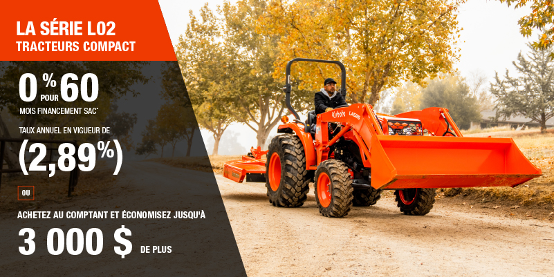 Voici un exemple de financement représentatif pour le L2502: un montant de 38 662,46 $ financé à 0% (taux annuel effectif global de 2,89% incluant 1 811,87 $ en comptant qui ne peut être combinées avec des offres de financement) correspond à un paiement bihebdomadaire de 201,02 $ pendant 60 mois. Répartis sur 60 mois, 130 paiements bihebdomadaires sont requis. Un acompte initial de 2 903,63 $ est requis. Le coût d'emprunt est de 1 811,87 $ pour une obligation totale de 38 662,46 $. Le financement est offert sur approbation du crédit. Les prix et paiements incluent les coûts de transport et les autres frais applicables (dont les frais environnementaux, les frais de gestion, les frais de préparation, et les frais du concessionnaire pour le modèle précisé). Remise de 1 500 $ disponible sur les achats au comptant d'un nouveau L2502 seulement. Remise de 2 500 $ disponible sur les achats au comptant d'un nouveau L3302/L3902 seulement. Remise de 3 000 $ disponible sur les achats au comptant d'un nouveau L4802 seulement. L'offre est valide jusqu'au 12-01-2026