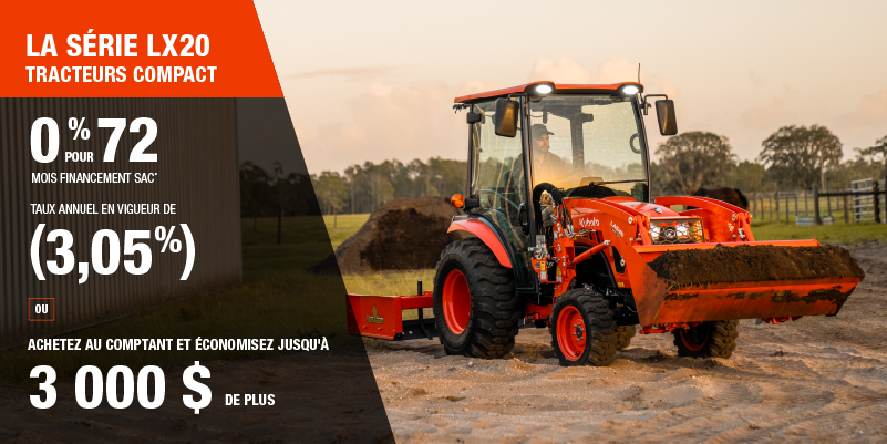 Voici un exemple de financement représentatif pour le LX2610SUHSD: un montant de 33 249,24 $ financé à 0% (taux annuel effectif global de 3,05% incluant 2 003,57 $ en comptant qui ne peut être combinées avec des offres de financement) correspond à un paiement bihebdomadaire de 148,19 $ pendant 72 mois. Répartis sur 72 mois, 156 paiements bihebdomadaires sont requis. Un acompte initial de 2 568,68 $ est requis. Le coût d'emprunt est de 2 003,57 $ pour une obligation totale de 33 249,24 $. Le financement est offert sur approbation du crédit. Les prix et paiements incluent les coûts de transport et les autres frais applicables (dont les frais environnementaux, les frais de gestion, les frais de préparation, et les frais du concessionnaire pour le modèle précisé). Le rabais présenté est offert avec un modèle LX10 Cab et LX2610 Rops et s'élève à 1 000,00 $, ou de 2 000,00 $ à l'achat d'un modèle LX3310 Rops. Le rabais s'applique avant les taxes et implique obligatoirement l'achat de l'unité motrice. L'offre ne s'applique pas aux transactions passées et n'a aucune valeur de rachat. Remise de 2 000 $ disponible sur les achats au comptant d'un nouveau LX2610/LX3310 Rops seulement. Remise de 3 000 $ disponible sur les achats au comptant d'un nouveau LX10 Cab seulement. L'offre est valide jusqu'au 12-01-2026