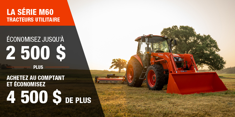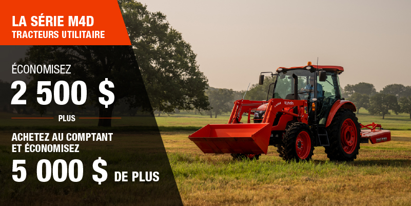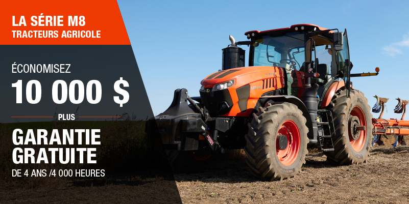 Les rabais présentés sont offerts à l'achat d'un modèle 128 neuf qui n'a jamais été immatriculé précédemment est de 10 000,00 $. L'offre ne s'applique pas aux transactions passées et n'a aucune valeur de rachat. La garantie de 4 ans ou de 4 000 h sur le groupe motopropulseur du modèle M8 et n'est valide que sur les produits distribués par Kubota Canada ltée. La ou les remises s'appliquent avant les taxes. L'offre ne s'applique pas aux transactions antérieures et n'a aucune valeur de rachat. L'offre est valide jusqu'au 12-01-2026