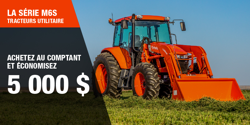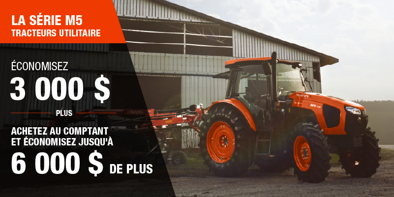 Les rabais présentés sont offerts à l'achat d'un modèle M5 neuf qui n'a jamais été immatriculé précédemment est de 3 000,00 $. L'offre ne s'applique pas aux transactions passées et n'a aucune valeur de rachat. Le rabais de 5 000 $ sur un M5 Rops neuf n'est offert que pour les achats au comptant, le rabais de 6 000 $ n'est offert que pour les achats au comptant d'un M5 Cab neuf. Le(s) rabais s'applique(nt) avant les taxes. L'offre ne peut s'appliquer à des transactions antérieures et n'a pas de valeur de rachat. L'offre est valide jusqu'au 12-01-2026