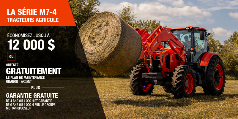 Le rabais présenté est offert avec un modèle M7-4 Deluxe est de 10 000,00 $, ou de 12 000,00 $ à l'achat d'un modèle M7-4 Premium. Pour plus de détails sur le Plan de Maintenance orange - Argent, veuillez consulter la brochure sur la Maintenance orange. La garantie de 4 ans ou de 4 000 h, ou de 6 ans ou de 4 000 h sur le groupe motopropulseur du modèle M7-4 et n'est valide que sur les produits distribués par Kubota Canada ltée. Cette garantie est la meilleure de l'industrie pour les tracteurs de 120 à 170 HP au chapitre des heures ou de la durée. La ou les remises s'appliquent avant les taxes. L'offre ne s'applique pas aux transactions antérieures et n'a aucune valeur de rachat. L'offre est valide jusqu'au 12-01-2026