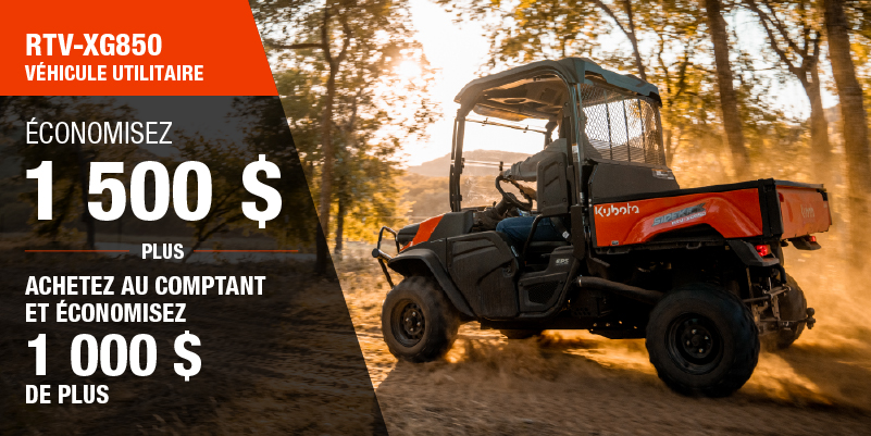 Les rabais présentés sont offerts à l'achat d'un modèle RTV-XG neuf qui n'a jamais été immatriculé précédemment est de 1 500,00 $. L'offre ne s'applique pas aux transactions passées et n'a aucune valeur de rachat. Remise de 1 000 $ disponible sur les achats au comptant d'un nouveau RTV-XG850 seulement. L'offre est valide jusqu'au 12-01-2026