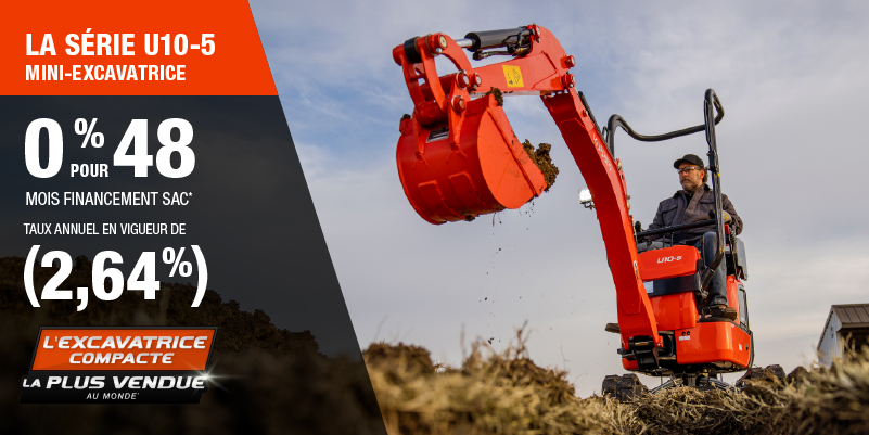 Voici un exemple de financement représentatif pour le U10-5: un montant de 40 107,11 $ financé à 0% (taux annuel effectif global de 2,64% incluant 1 877,01 $ en comptant qui ne peut être combinées avec des offres de financement) correspond à un paiement de 752,01 $ par mois pendant 48 mois. Un acompte initial de 4 010,71 $ est requis. Le coût d'emprunt est de 1 877,01 $ pour une obligation totale de 40 107,11 $. Le financement est offert sur approbation du crédit. Les prix et paiements incluent les coûts de transport et les autres frais applicables (dont les frais environnementaux, les frais de gestion, les frais de préparation, et les frais du concessionnaire pour le modèle précisé). Kubota est le numéro un mondial des ventes de pelles compactes depuis 20 ans. Clause de non-responsabilité : Selon les données de 2023 d'Off-Highway Research incluant toutes les ventes de la marque du groupe Kubota. L'offre est valide jusqu'au 12-01-2026