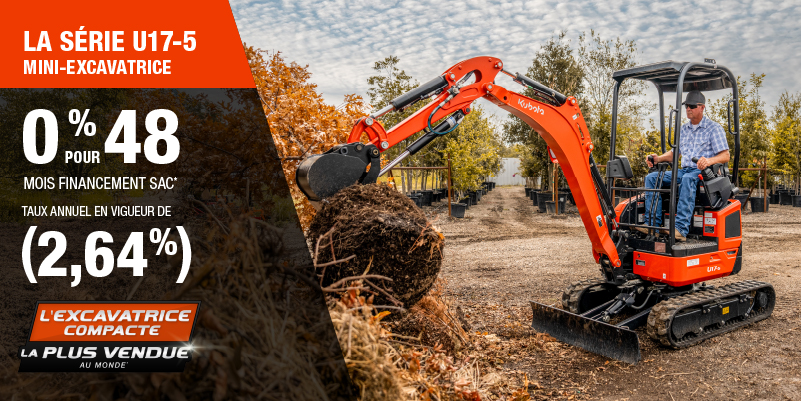 Voici un exemple de financement représentatif pour le U17-5: un montant de 50 446,13 $ financé à 0% (taux annuel effectif global de 2,64% incluant 2 360,88 $ en comptant qui ne peut être combinées avec des offres de financement) correspond à un paiement de 945,86 $ par mois pendant 48 mois. Un acompte initial de 5 044,61 $ est requis. Le coût d'emprunt est de 2 360,88 $ pour une obligation totale de 50 446,13 $. Le financement est offert sur approbation du crédit. Les prix et paiements incluent les coûts de transport et les autres frais applicables (dont les frais environnementaux, les frais de gestion, les frais de préparation, et les frais du concessionnaire pour le modèle précisé). Kubota est le numéro un mondial des ventes de pelles compactes depuis 20 ans. Clause de non-responsabilité : Selon les données de 2023 d'Off-Highway Research incluant toutes les ventes de la marque du groupe Kubota. L'offre est valide jusqu'au 12-01-2026