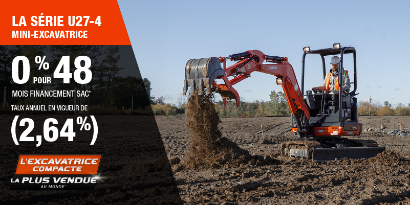 Voici un exemple de financement représentatif pour le U27-4: un montant de 67 828,75 $ financé à 0% (taux annuel effectif global de 2,64% incluant 3 174,39 $ en comptant qui ne peut être combinées avec des offres de financement) correspond à un paiement de 1 271,79 $ par mois pendant 48 mois. Un acompte initial de 6 782,88 $ est requis. Le coût d'emprunt est de 3 174,39 $ pour une obligation totale de 67 828,75 $. Le financement est offert sur approbation du crédit. Les prix et paiements incluent les coûts de transport et les autres frais applicables (dont les frais environnementaux, les frais de gestion, les frais de préparation, et les frais du concessionnaire pour le modèle précisé). Kubota est le numéro un mondial des ventes de pelles compactes depuis 20 ans. Clause de non-responsabilité : Selon les données de 2023 d'Off-Highway Research incluant toutes les ventes de la marque du groupe Kubota. L'offre est valide jusqu'au 12-01-2026