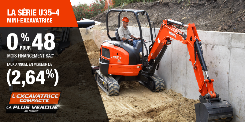 Voici un exemple de financement représentatif pour le U35-4: un montant de 85 546,39 $ financé à 0% (taux annuel effectif global de 2,64% incluant 4 003,57 $ en comptant qui ne peut être combinées avec des offres de financement) correspond à un paiement de 1 603,99 $ par mois pendant 48 mois. Un acompte initial de 8 554,64 $ est requis. Le coût d'emprunt est de 4 003,57 $ pour une obligation totale de 85 546,39 $. Le financement est offert sur approbation du crédit. Les prix et paiements incluent les coûts de transport et les autres frais applicables (dont les frais environnementaux, les frais de gestion, les frais de préparation, et les frais du concessionnaire pour le modèle précisé). Kubota est le numéro un mondial des ventes de pelles compactes depuis 20 ans. Clause de non-responsabilité : Selon les données de 2023 d'Off-Highway Research incluant toutes les ventes de la marque du groupe Kubota. L'offre est valide jusqu'au 12-01-2026