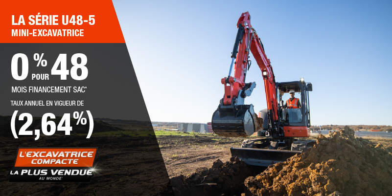Voici un exemple de financement représentatif pour le U48-5: un montant de 102 953,69 $ financé à 0% (taux annuel effectif global de 2,64% incluant 4 818,23 $ en comptant qui ne peut être combinées avec des offres de financement) correspond à un paiement de 1 930,38 $ par mois pendant 48 mois. Un acompte initial de 10 295,37 $ est requis. Le coût d'emprunt est de 4 818,23 $ pour une obligation totale de 102 953,69 $. Le financement est offert sur approbation du crédit. Les prix et paiements incluent les coûts de transport et les autres frais applicables (dont les frais environnementaux, les frais de gestion, les frais de préparation, et les frais du concessionnaire pour le modèle précisé). Kubota est le numéro un mondial des ventes de pelles compactes depuis 20 ans. Clause de non-responsabilité : Selon les données de 2023 d'Off-Highway Research incluant toutes les ventes de la marque du groupe Kubota. L'offre est valide jusqu'au 12-01-2026