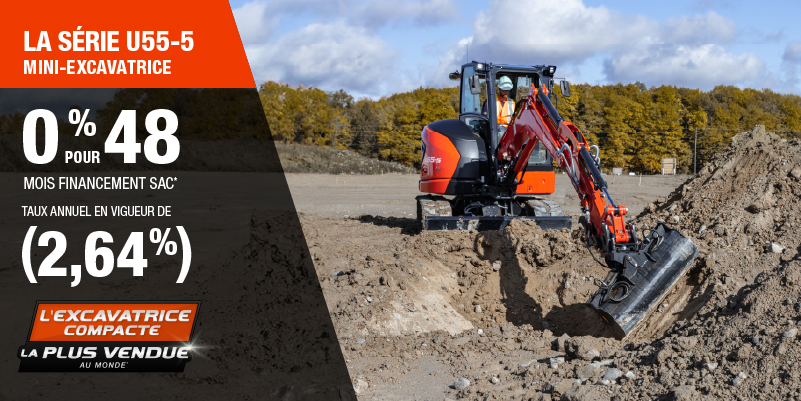 Voici un exemple de financement représentatif pour le U55-5: un montant de 122 059,55 $ financé à 0% (taux annuel effectif global de 2,64% incluant 5 712,39 $ en comptant qui ne peut être combinées avec des offres de financement) correspond à un paiement de 2 288,62 $ par mois pendant 48 mois. Un acompte initial de 12 205,96 $ est requis. Le coût d'emprunt est de 5 712,39 $ pour une obligation totale de 122 059,55 $. Le financement est offert sur approbation du crédit. Les prix et paiements incluent les coûts de transport et les autres frais applicables (dont les frais environnementaux, les frais de gestion, les frais de préparation, et les frais du concessionnaire pour le modèle précisé). Kubota est le numéro un mondial des ventes de pelles compactes depuis 20 ans. Clause de non-responsabilité : Selon les données de 2023 d'Off-Highway Research incluant toutes les ventes de la marque du groupe Kubota. L'offre est valide jusqu'au 12-01-2026